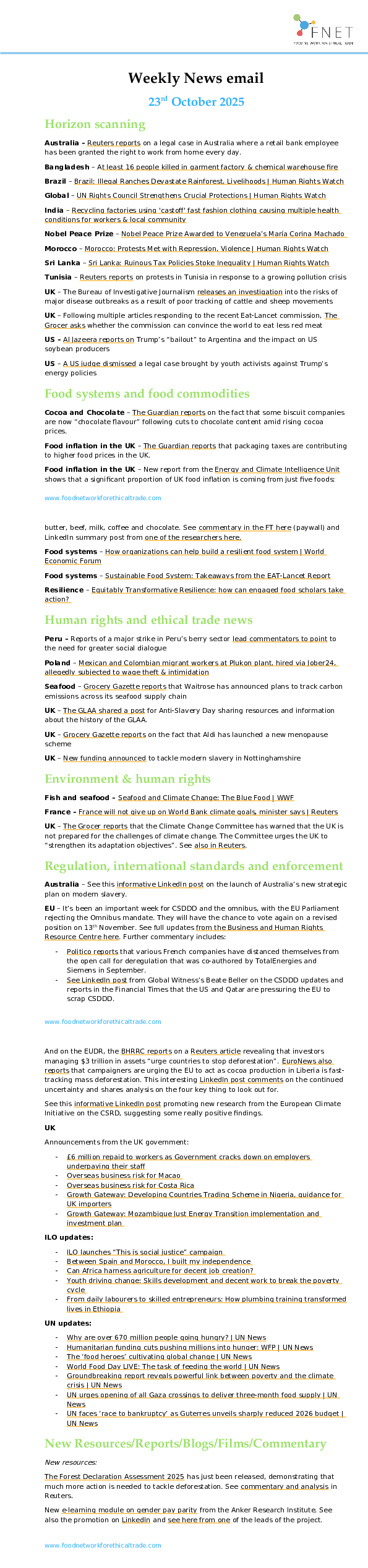Includes a link to the recent File on 4 programme (that we discussed in the Fortnightly call), an interesting new paper suggesting that just five products are responsible for a considerable amount of the food inflation in the UK (and all have been impacted by extreme weather), updates on CSDDD as the EU parliament rejected an omnibus proposal, continued updates on trade and food in the US, and much more!